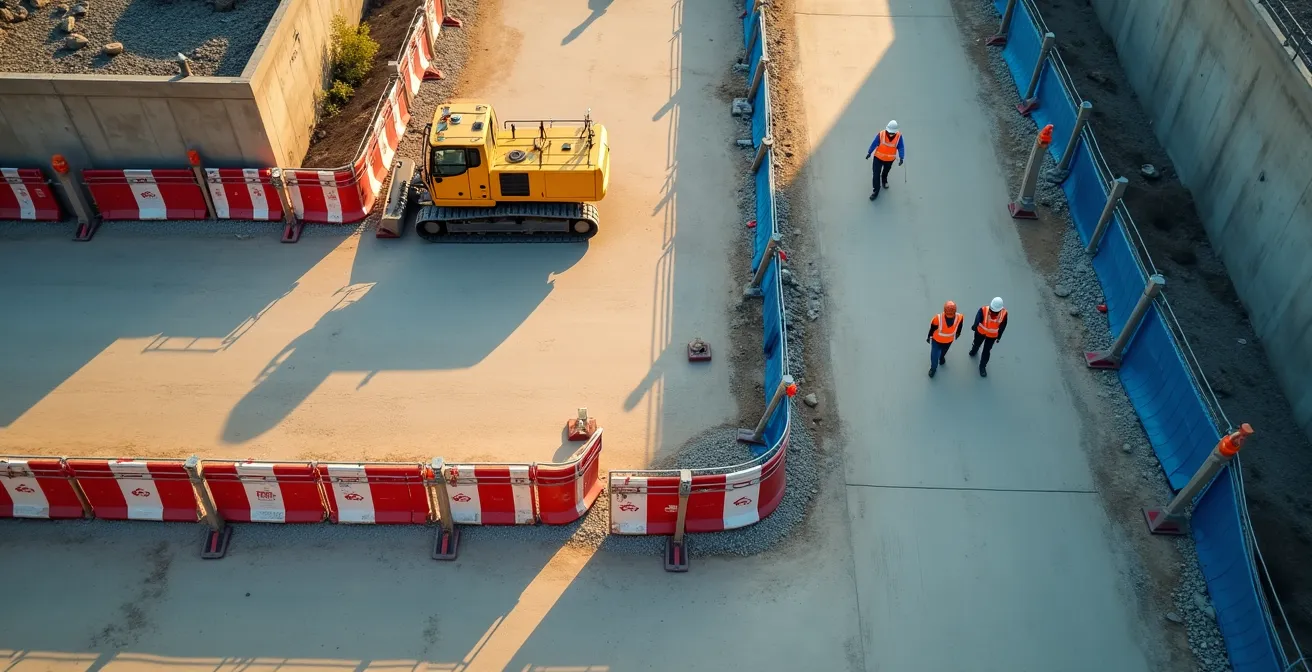 Le cheminement doit être stabilisé (avec du gravier ou des plaques de roulage) pour éviter les chutes et les glissades, et avoir une largeur suffisante pour permettre le passage aisé, y compris avec du petit matériel. La protection latérale est l’élément crucial : elle doit être constituée de barrières capables de résister à un choc léger et de dissuader toute tentation de couper à travers le chantier. Une étude de la coactivité sur les chantiers BTP a d’ailleurs démontré qu’une telle séparation physique entraînait une réduction de 73% des collisions engins-piétons, prouvant l’efficacité d’une approche non-négociable sur la séparation des flux.
