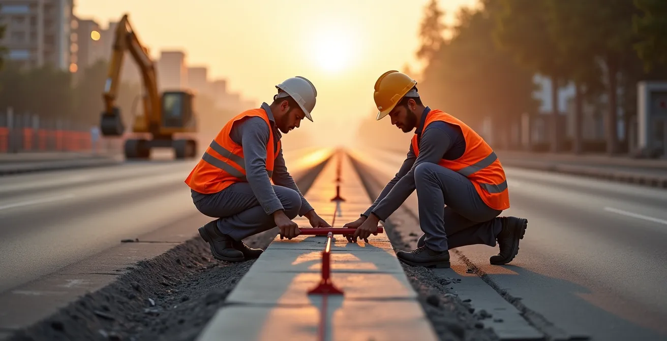 La fierté d’un maçon VRD ou d’un chef d’équipe se mesure souvent à l’œil. Un alignement de bordures qui file droit sur 100 mètres, sans une vague ni un décalage, est la signature d’un travail maîtrisé. Beaucoup pensent que le secret réside dans un cordeau tendu à la perfection et un bon coup de maillet. Si ces gestes sont essentiels, ils ne sont que la partie visible d’un savoir-faire bien plus profond. La véritable excellence ne se joue pas en surface, mais dans les couches invisibles du chantier, là où les amateurs commettent leurs plus grandes erreurs.